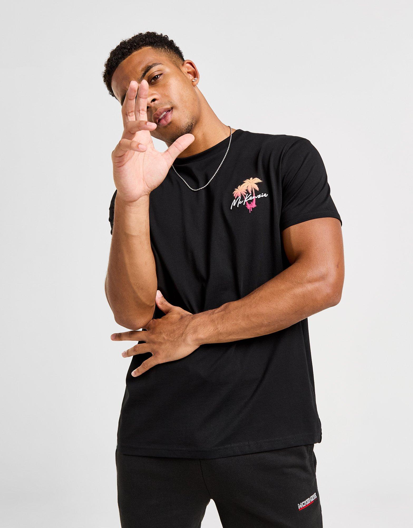 Upgrade your everyday staples with this men's Horizon T-Shirt from McKenzie. In a Black colourway, this regular-fit tee is made with soft, lightweight cotton for durable comfort. It features a ribbed crew neckline and short sleeves for an easy feel, and is finished with a bold McKenzie branded palm tree graphic to the back. Signed off with a downsized logo at th chest. Machine washable. | Our model is 6'1" with a 39" chest and wears a size medium.