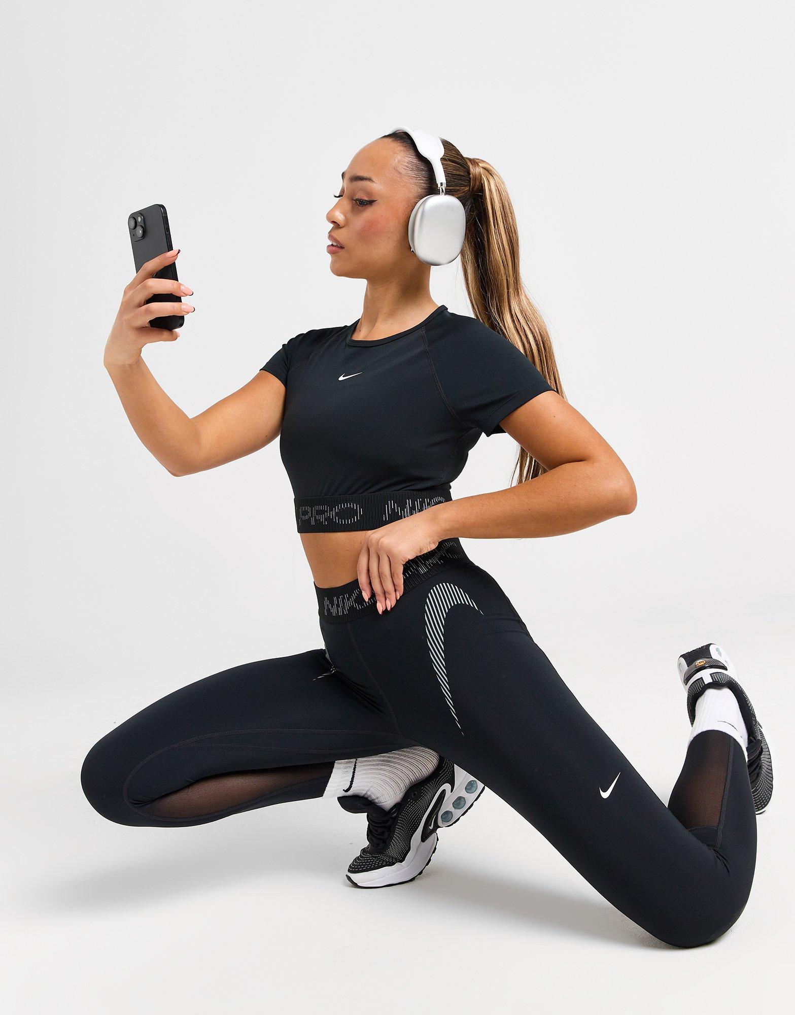 Freshen up your gym staples with these women's Training Pro Leggings from Nike. In a Black colourway, these tights are cut from a smooth, stretchy poly fabric for breathable comfort. They're crafted with Dri-FIT technology to wick away sweat, and feature a specially-crafted jacquard elastic waistband for a sleek and secure fit. Finished with Nike branded graphics throughout. Machine washable. | Our model is 5'8" and wears a size small.