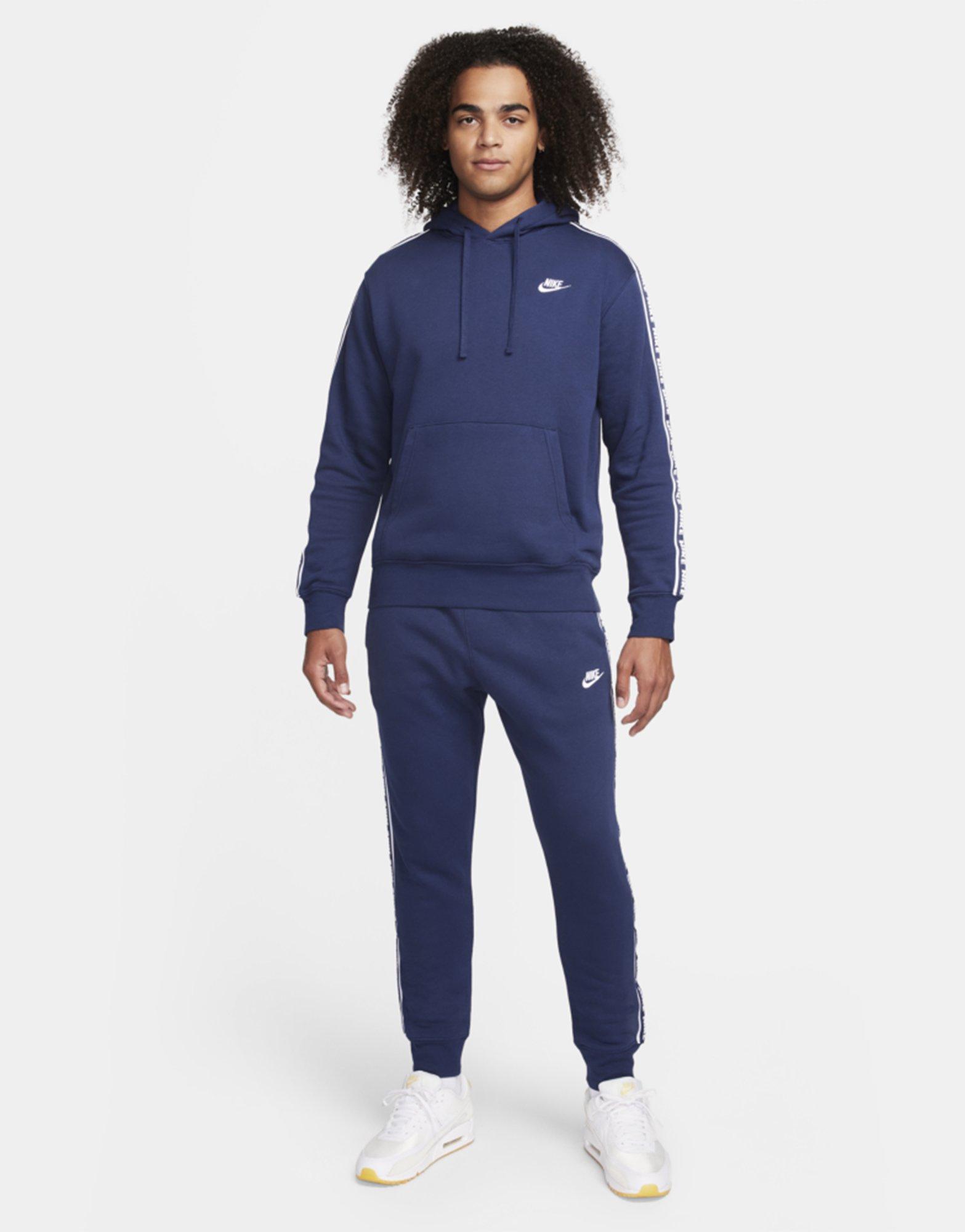 Bring the street-ready energy with this men's Aries Tracksuit from Nike. In a Midnight Navy colourway, this standard-fit tracksuit is made with soft cotton-blended fleece for lasting comfort. It includes a long-sleeve pullover with an adjustable hood for a custom feel, and matching joggers with an elastic waistband. It has stretchy ribbed trims to secure the fit, and pockets throughout for storage. Finished with contrast taping down the sides and signature Swoosh branding. Machine washable.